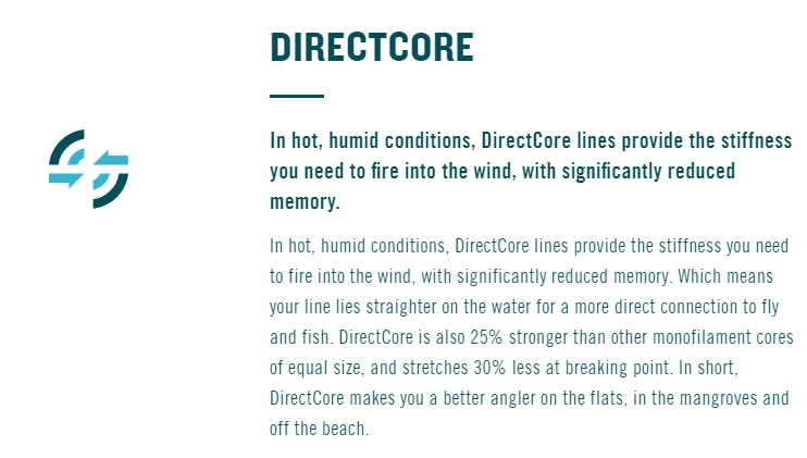 De RIO Products DirectCore Bonefish Fly Line heeft een lange buik en achterste taper uit de lus stabiel te houden en om lange efficiënte worpen te maken, terwijl de mid lengte front taper een goed overslaan oplevert van leader en vlieg en een eenvoudige presentatie van de typische bonefish vliegen mogelijk maakt. Elke RIO Products DirectCore Bonefish Fly Line is gebouwd op RIO Product’s DirectCore met weinig geheugen, deze is uiterst gemakkelijk te strekken en ligt perfect recht op het water, maar behoudt de stijfheid die nodig is om te werpen onder warme omstandigheden. Een hoog drijvende coating zorgt ervoor dat de volglijn niet zal zinken tijdens het waden.