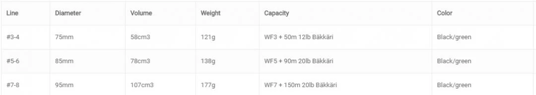 Het grootste model kan met gemak een #10 Big Daddy vliegenlijn en 50 meter 30 lb backing bevatten, wat het een geschikt stukje gereedschap maakt voor de jagers op grote snoek.